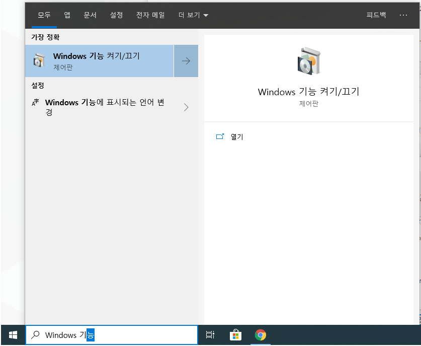 Windows 내에서도 기능가 메뉴가 많아짐에 따라 하나씩 메뉴 트리를 따라가는 방식으로는 메뉴에 대한 접근에 다소 시간이 걸려 "Windows 키" 를 누른 후 찾고자 하는 메뉴를 입력하면 바로 검색이 가능하다. "Windows 기능 켜기/끄기" 를 입력해 해당 메뉴를 실행한다.