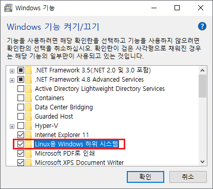 "Windows 기능 켜기/끄기" 를 누르면 여러 Windows 기능들이 나오는데 이중 "Linux용 Windows 하위 시스템"을 선택하여 활성화한다.