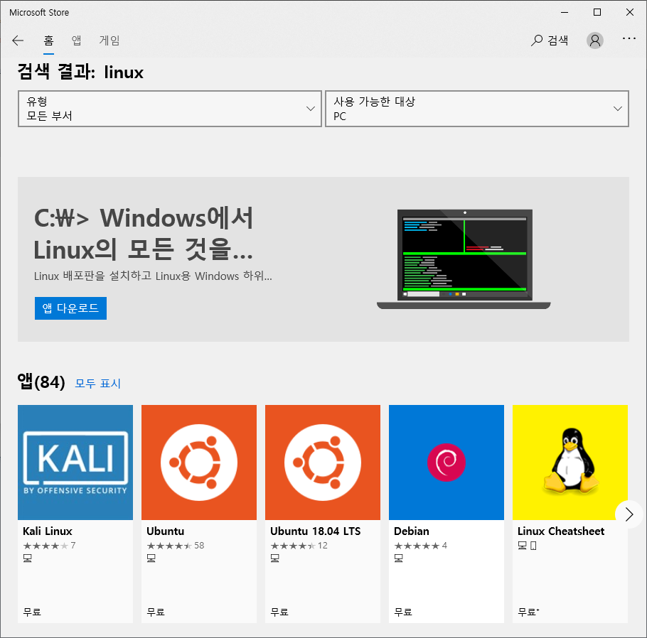 2) 재부팅 이후 Microsoft Store 에서 원하는 Linux 배포판을 설치한다.