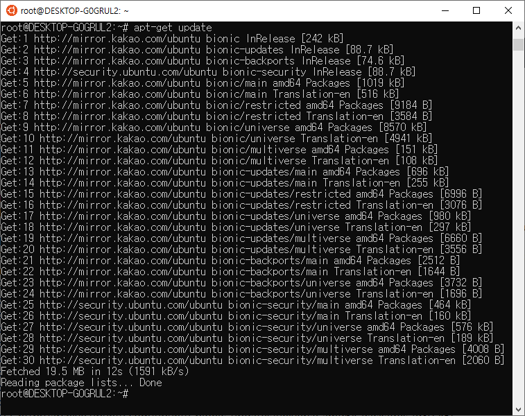 서버 주소 변경 후 apt-get update 를 다시 하게 되면 별다른 error 없이 package list 를 받아오는 것을 볼 수 있다.