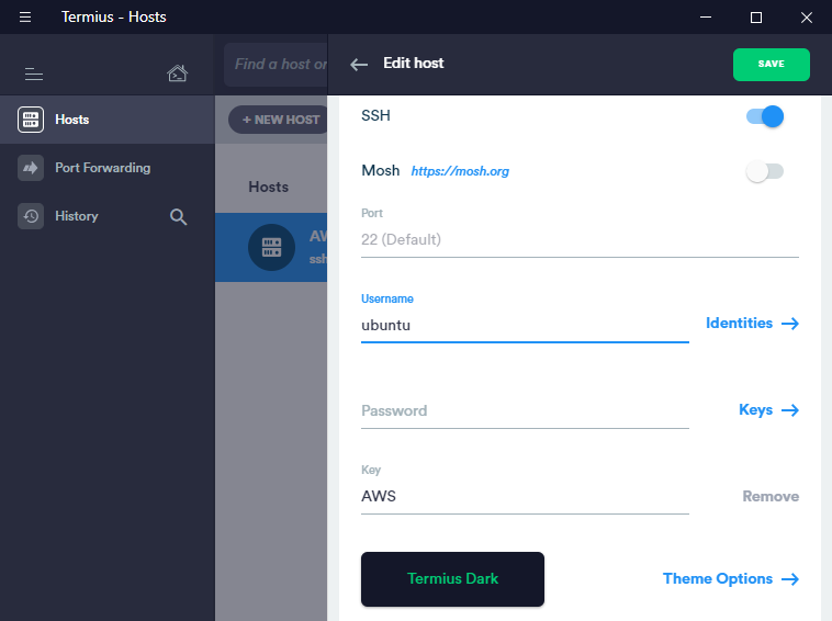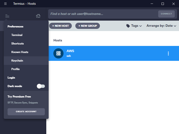 Termius 를 설치하고 실행하면 다음과 같은 화면을 볼 수 있다. (Free download version)