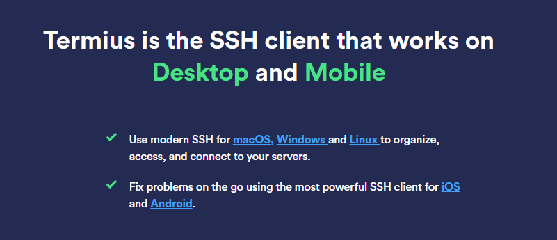 termius 의 가장 큰 장점은 Desktop과 Mobile을 포함하여 다양한 OS (macOS, Windows, Linux, iOS, Android)를 지원한다는 것이다. multiplatform 에서 동작하기 때문에 다양한 OS 상에서 ssh 접속에 대해 동일한 경험을 가질 수 있다.
