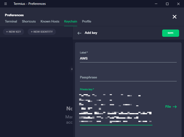 3) 새로운 "Label" 을 입력하고 "File ->" 을 눌러 AWS 에서 다운로드하여 변환한 ppk 파일을 로딩한다.