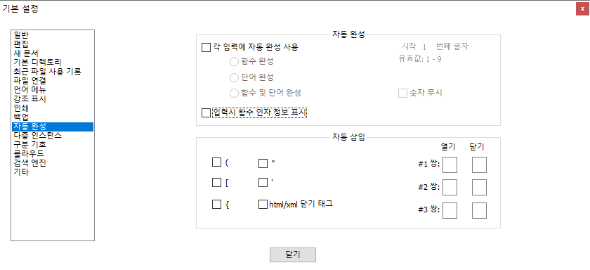 환경 설정 팝업창을 보면 자동 완성 항목을 볼 수 있다.