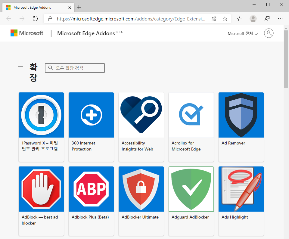 기본적으로 [설정 > 확장] 을 통해 Microsoft Edge Addons 를 사용할 수 있다.