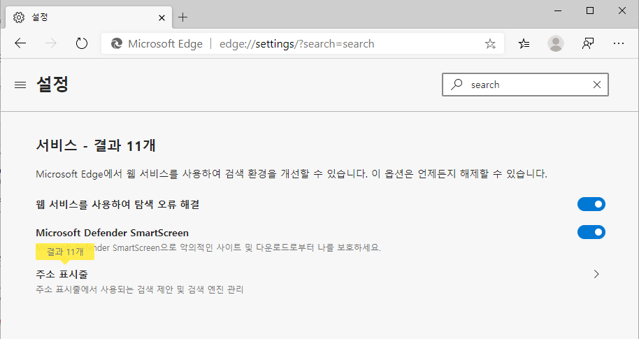 2) 오른쪽 상단 ... 버튼을 눌러 설정 진입 후 "search" 를 키워드로 검색 후 "주소 표시줄" 선택