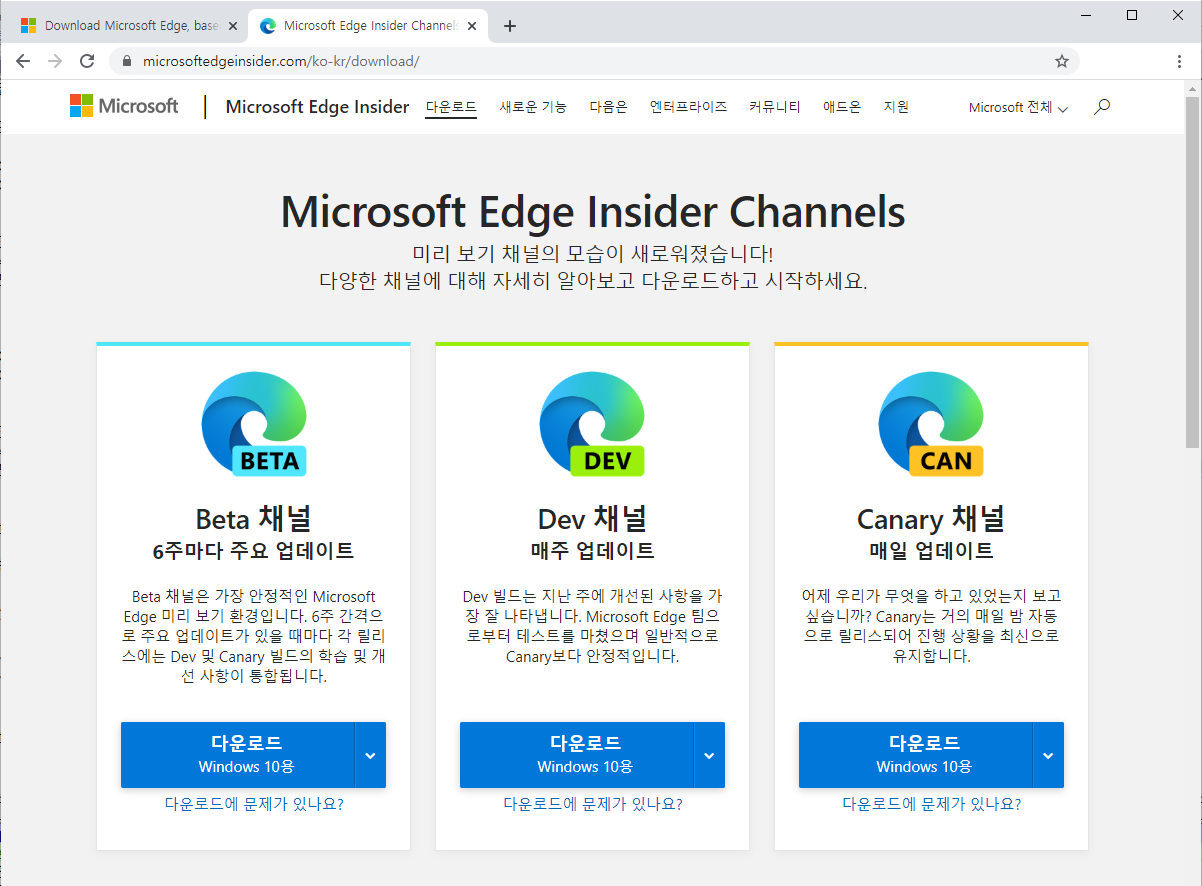 만약 좀 더 최신의 Edge 를 사용하고 싶다면 아래 Edge Insider Channels Page로 접속한다.