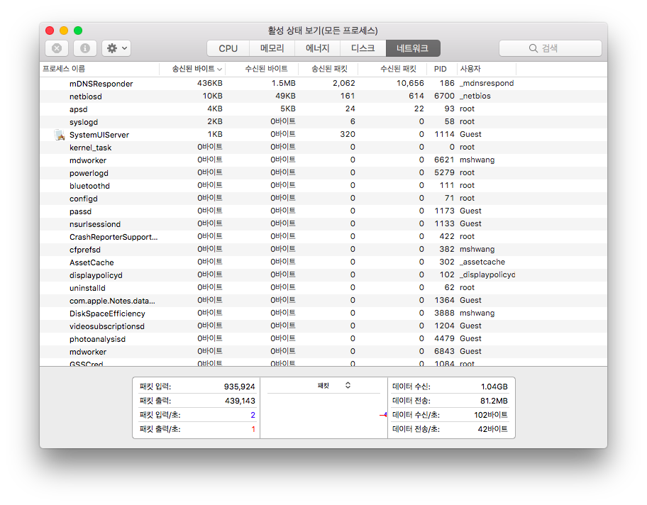 각 프로세스의 네트워크 사용 현황을 확인 할 수 있다.