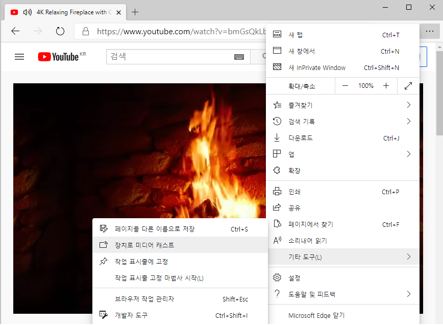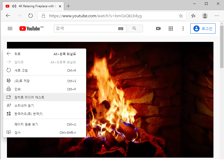 이런 상황에서 빈 화면의 아무 곳을 선택하여 마우스 오른 버튼을 눌러 나오는 메뉴 중 "장치로 미디어 캐스트" 를 선택하거나,