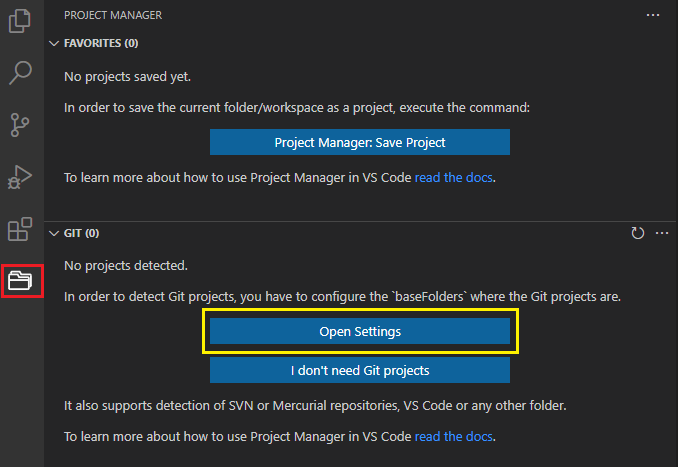 Extension tab 에서 "Project Manager"를 검색하여 install 하면 왼쪽 side bar 에 "Project Manager" tab 이 생성된다.