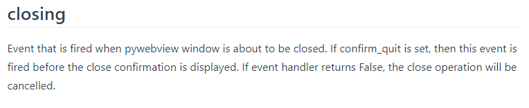 이를 위해 링크(API | pywebview (flowrl.com))를 검토해 보니 closing event를 처리하는 on_closing 내에서 False 를 return 하면 close 처리를 하지 않는다는 것을 확인했다.