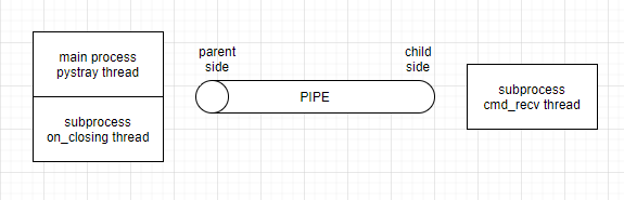 이 후 같은 subprocess 내지만 다른 thread 인 on_closing 에서 cmd_recv 로 cmd를 전송하기 위해 parent pipe와 child pipe를 이용하게 한다.